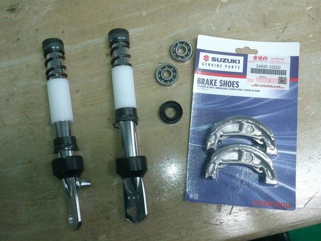 中古車再商品化の通常内容 部品交換確認 レッツ4K9 ダストシールが切れているフロントフォークパイプ、 年数を経た、ブレーキシュー、フロントホイールベアリングとオイルシール フロントアクスルシャフトとセルフロックナット フロントフォークステアリングステムベアリング目視点検がてら フォークステムをフレームに逆さまに刺して、上方からフォークパイプ交換 販売車両出来る範囲で確認点検はイコールで目視になるよう努めております。