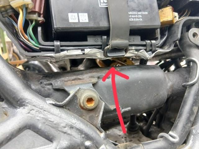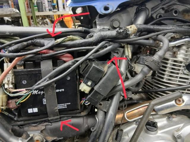 車体後部のメインハーネスも取り回しが間違っていました。ハーネスはバッテリーのゴムバンドと共締めですが上で束ねてあります。 またバッテリーケースのネジがついていないため、ハーネスに上から押されマフラーとバッテリーケースが接触していました。