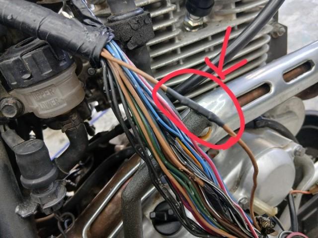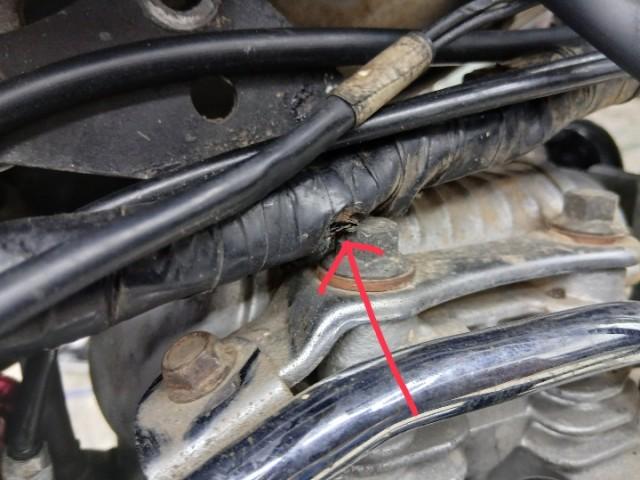 メインハーネスを点検 取り回しが違いエンジンハンガーのボルトもいない、シリンダーヘッドカバーのボルトにメインハーネス干渉してます。 エンジンハンガーのボルトは中古のボルトを取り付けました
