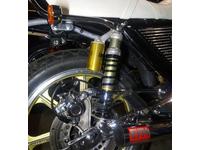 フレームパウダーコート、スイングアーム、ライトステー、フロントフォーク、ホイールなどもリペイントし、消耗部品からカスタム部品まで新品を使用して組み上げました!