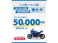 | リアタイヤロック&ハンドルロックによる盗難防止セキュリティも標準装備!今だけ超特典!GOGO大放出!5万円分QUOカードキャンペーン実施中!期間:2025年9月12日(金)〜10月19日(日)内容:126cc以上で買い換え応援・免許取得応援の対象の方に5万円分のQUOカードをプレゼントいたします。※通常時の買い換え応援・免許取得応援の特典も選べますので詳しくはスタッフにお尋ねください。【対象条件】・バイク王の会員登録(無料)がお済みの方。・納車整備を実施のうえ、納車されていること。その他注意事項がございます。詳しくはバイク王公式HPをご確認ください。 |