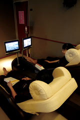 リラクゼーションルームでは静かにゆっくりと休んでもらうため、 18歳未満の入室を控えてもらっています。 手元のインターホンでは飲み物や軽食のオーダーもお願いできます。 極楽極楽。