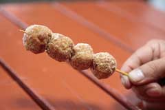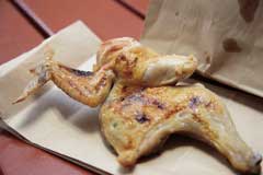 地元の超人気店。メニューは若鳥料理と野菜、飲み物だけなので、バイクで行くならテイクアウトがお薦め。僕は若鳥の半身をそのまま焼いた塩焼(1050円)と、チキンボール(150円)をゲット。