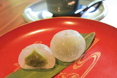 若杉山の湧水“分椙の名水”で作るだご汁が名物の食事処。 カフェメニューもあり、 3種から選ぶ手作り和菓子(黒餅米のおはぎ、 抹茶あんこのこんにゃく餅/写真、 白玉の黒蜜かけ)と珈琲のセット(各600円)がおススメだ。